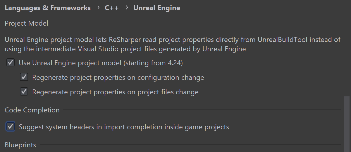 补全时自动导入功能可以为您节省大量时间。 但是,如果它添加了不正确的 #include 指令,则问题可能难以检测。 我们一直在努力完善此功能,并确保它不会在自动导入时从系统头中建议不需要的实体。 默认情况下,不会建议系统头,但如果您需要,可以在 Settings/Preferences | Languages & Frameworks | C++ | Unreal Engine(设置/偏好设置 | 语言和框架 | C++ | Unreal Engine)中启用。