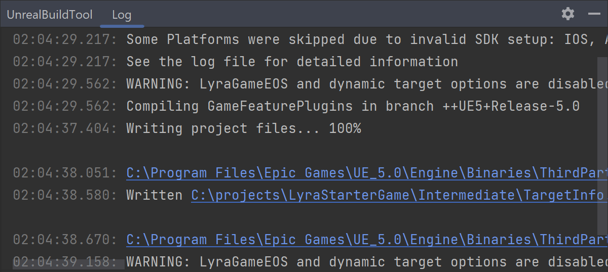 我们改进了 UnrealBuildTool 日志的表示。 为确保您不会错过有关项目配置的任何警告或错误,日志面板现在包括时间戳,并保留 UnrealBuildTool 先前运行的日志。