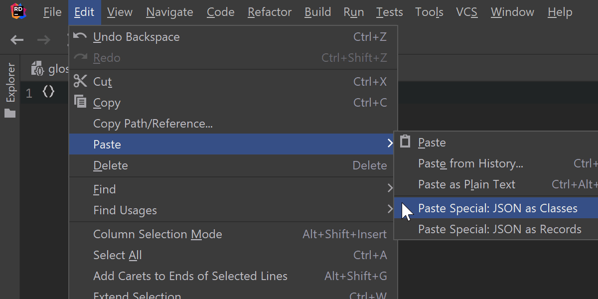 新增的 Edit | Paste Special: JSON as Classes(编辑 | 特殊粘贴:将 JSON 作为类)操作可以“智能粘贴”对象。 例如,使用此操作复制粘贴 JSON 时,它将根据该 JSON 自动生成 C# 类。