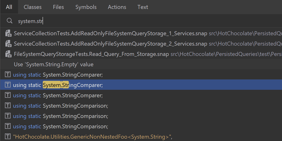 我们微调了 Search Everywhere(随处搜索)结果列表背后的算法,使其行为更可预测,使其能够更准确地选择您正在搜索的元素。 现在,开始输入查询时,IDE 会冻结出现的第一个搜索结果,并且不会在找到更多选项时对其重新排序(早期版本的情况)。