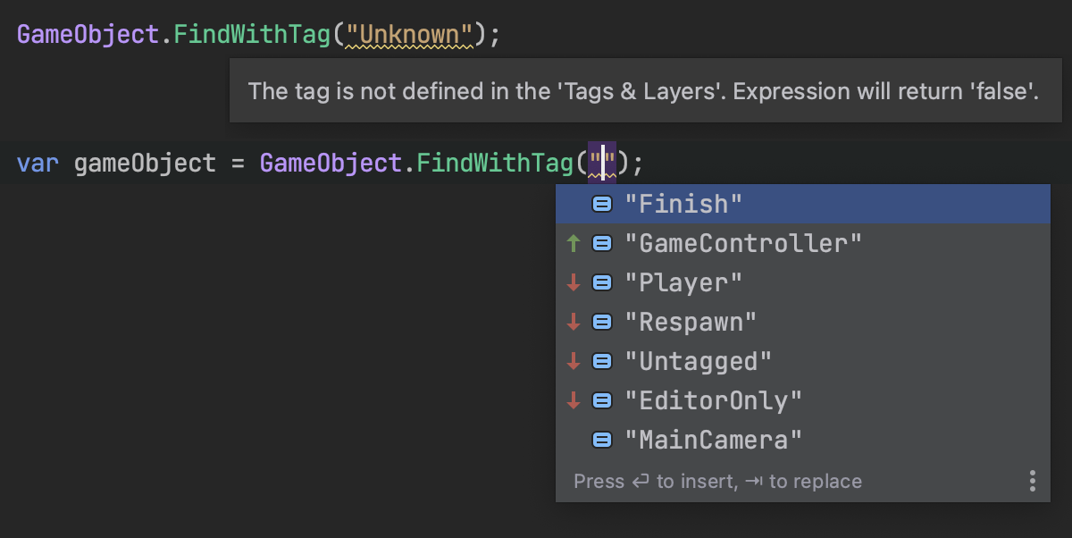 Rider 已经为多个版本提供了标记名称的补全和验证,2022.3 版本添加了对 GameObject.FindWithTag 方法组的新支持。 它会在您输入时提供代码补全,并在您尝试使用项目中不存在的标记时发出警告。