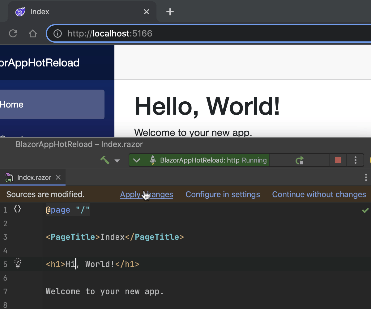 Rider 2022.3 为 Blazor Server 应用引入了热重载。 当您在 Blazor Server 应用运行时修改应用中的源代码时,Rider 会询问您是否要将此更改应用于正在运行的应用而不重新启动应用。 注意文本编辑器顶部的黄色 Sources are modified(源已修改)通知栏。 接受更改后,应用将即时更新,您可以继续使用更新后的应用。