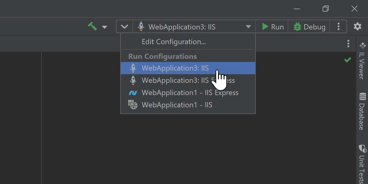为了响应社区的普遍要求,我们添加了新的 IIS Application 运行配置,用于在 IIS 服务器上运行和调试经典的 ASP.NET 应用程序。 我们还为 ASP.NET Core 应用程序引入了对来自 launchSettings.json 文件的 IIS 命令名称的支持。