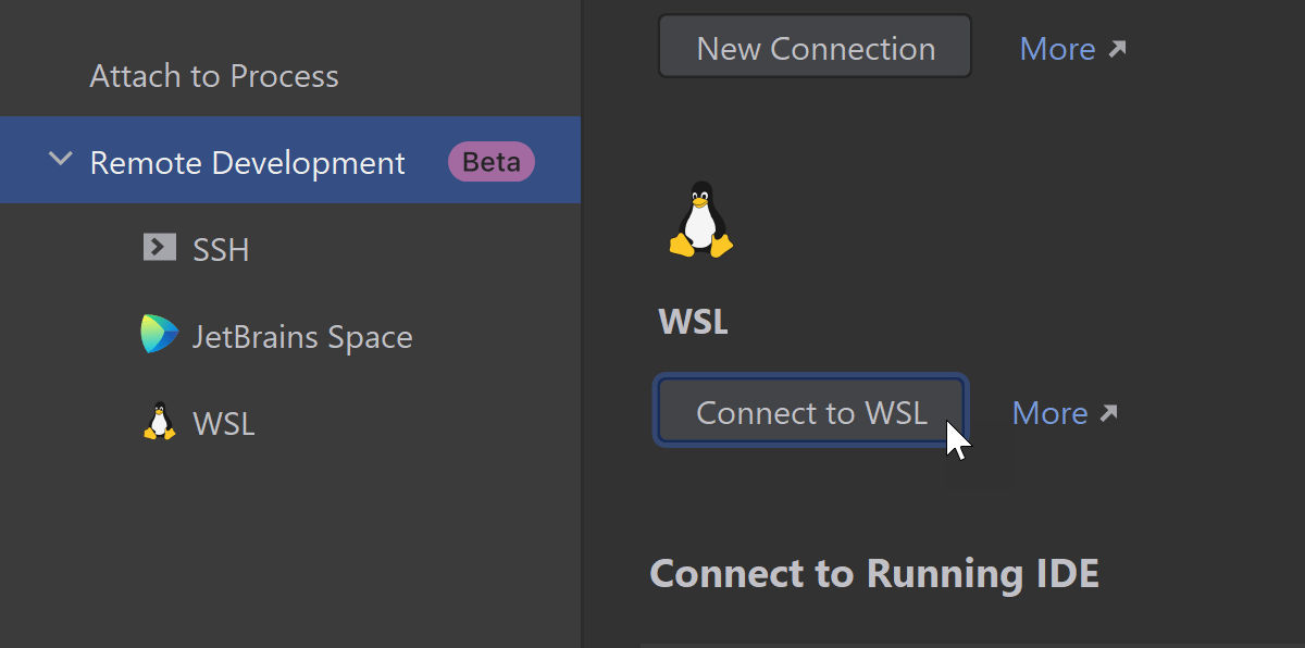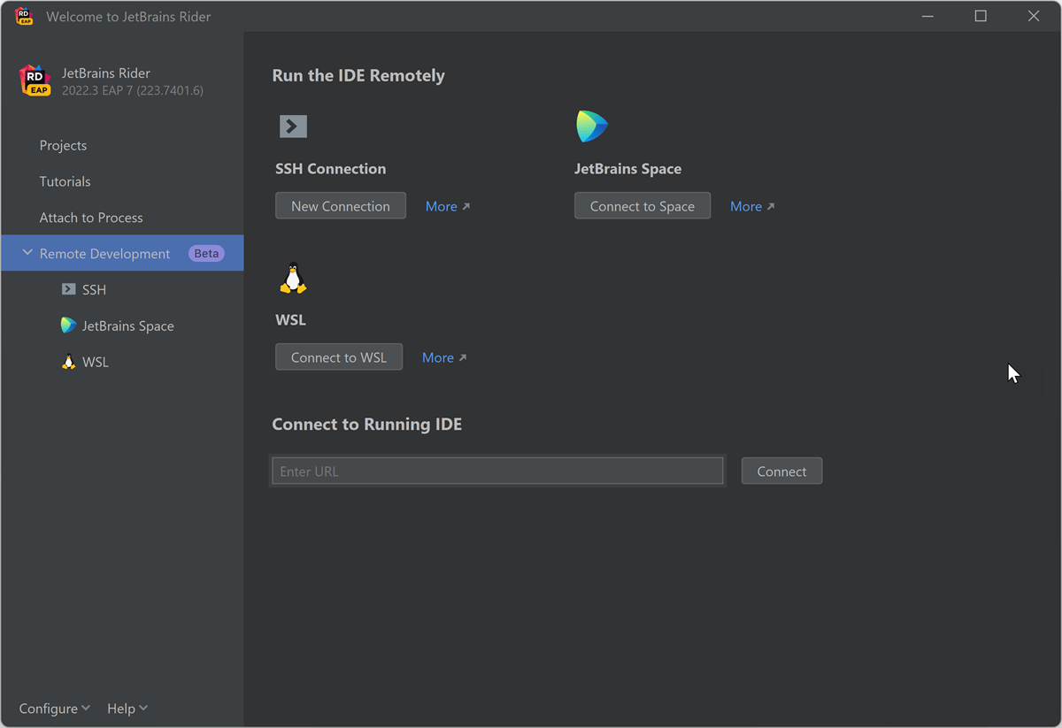 可以从 Rider 的欢迎屏幕启动一个简单的设置过程。 UI 将通过远程开发功能提供,这意味着无需 WSLg,本地 RemoteDev 客户端将自动安装。 如需更多信息,请参阅远程开发 文档.