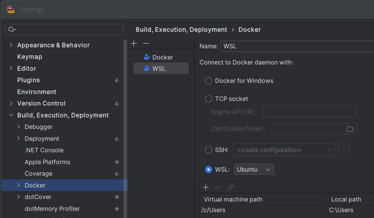 我们的最新版本引入了以快速模式运行 Docker 的选项。 从 Rider 2023.2 开始,在 WSL 上也能够以快速模式使用 Docker。 要在没有 Docker Desktop 的 Windows 机器上运行 Docker 容器,您首先需要安装 WSL,在 Linux 发行版上安装 Docker,并将 WSL 添加到 Rider Settings/Properties(设置/属性)下的 Build, Execution, Deployment | Docker(构建、执行、部署 | Docker)。 然后,您将能够在 WSL 上运行和调试 Docker 容器(使用或不使用快速模式)。