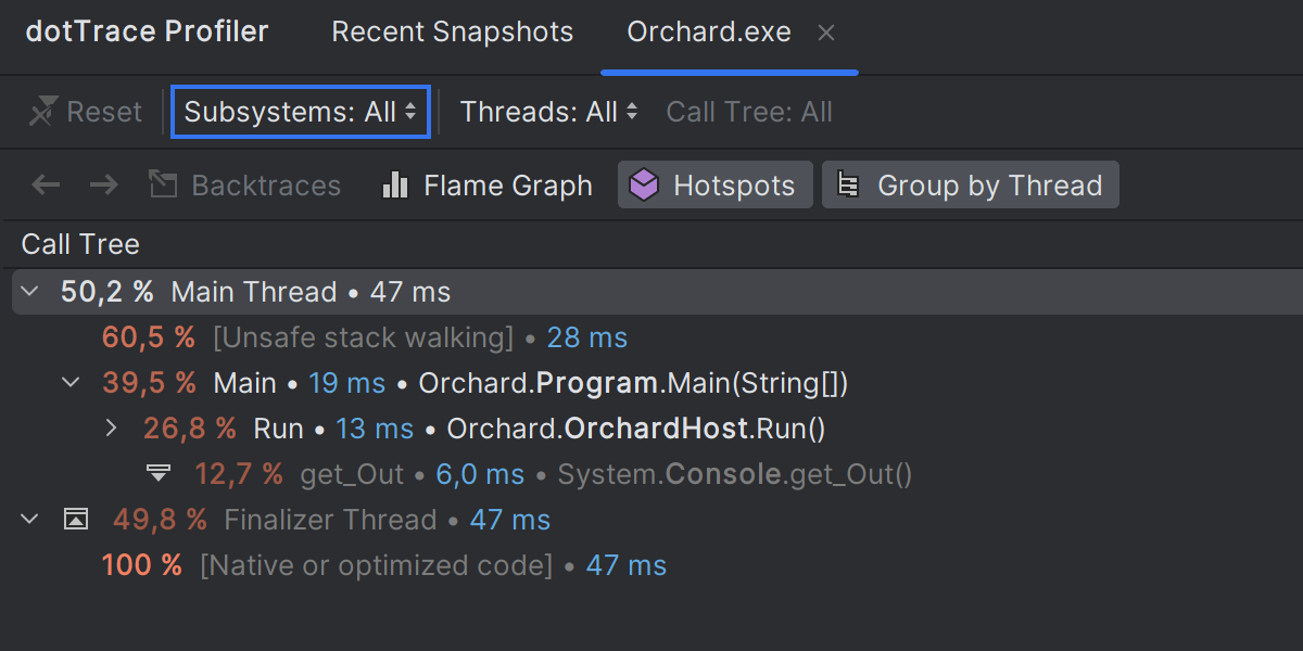现在,Call Tree(调用树)视图能够按各个线程对调用堆栈分组,让您可以更深入地了解线程特定的性能问题。