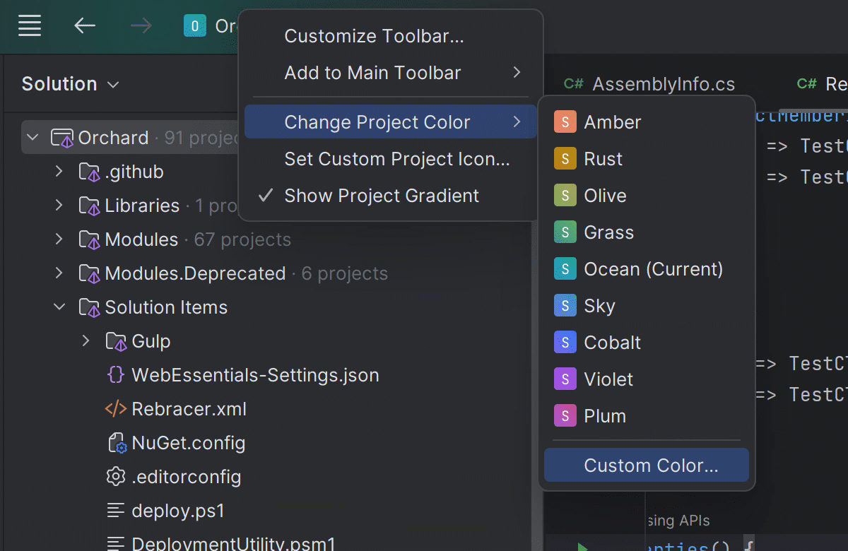 使用 Rider 2023.2,您可以按颜色在打开的项目之间导航! 标题现在默认带有预定义的颜色,您也可以根据自己的喜好进行更改。 要为项目设置新的颜色,请右键点击标题,访问上下文菜单。 选择 Change Toolbar Color(更改工具栏颜色)选项,然后选择您想要的颜色。 要禁用此功能,只需在上下文菜单中取消选择 Use Project Colors in Toolbar(在工具栏中使用项目颜色)选项即可。