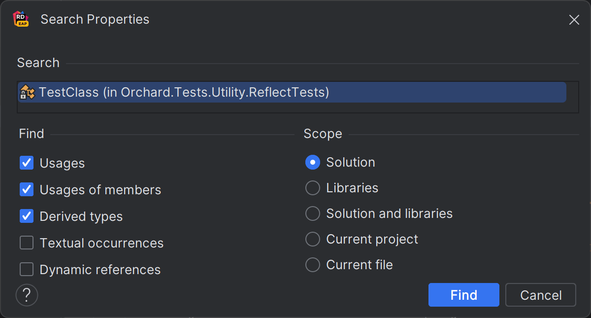 在 Rider 2023.2 中,Rider 中的 Find Usages(查找用法)功能获得了功能升级。 现在,如果在符号(如方法、类或变量)上调用 Find Usages Advanced(高级查找用法),IDE 将显示一个窗口,您可以在其中指定额外搜索条件。