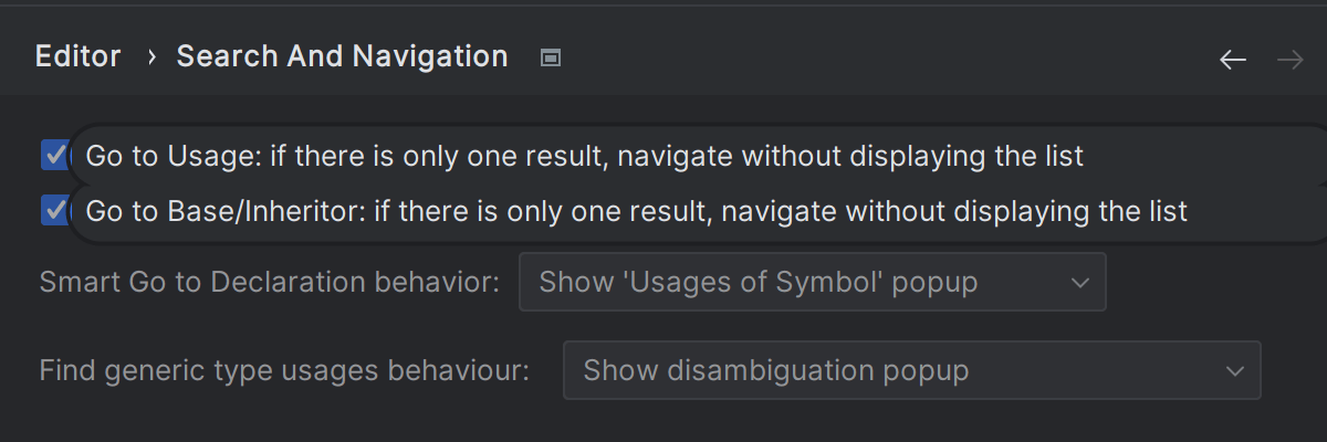 为了改善代码库导航体验,我们在 Settings / Preferences | Editor(设置/偏好设置 | 编辑器)下的专属 Search and Navigation(搜索和导航)页面中添加了许多实用选项。