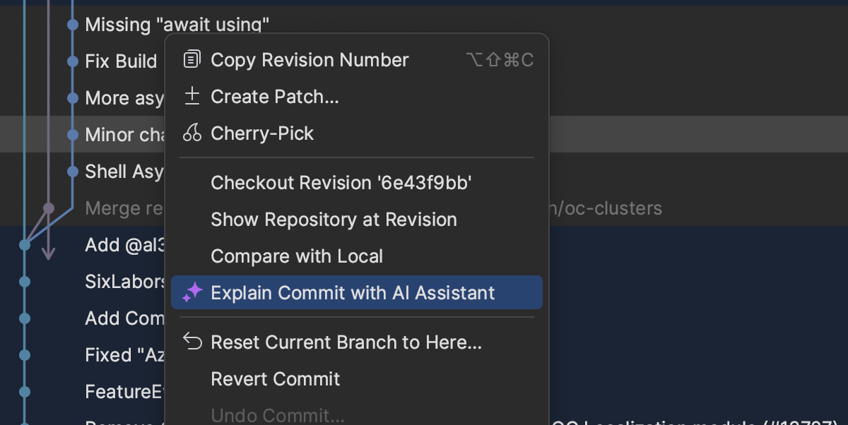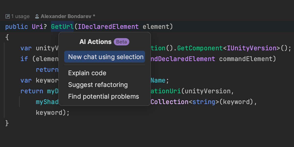 在编辑器中选择特定代码段,然后从 AI Actions…(AI 操作…)上下文菜单调用操作。