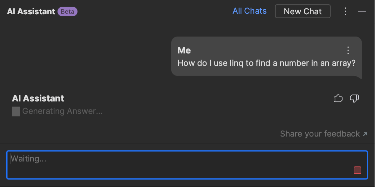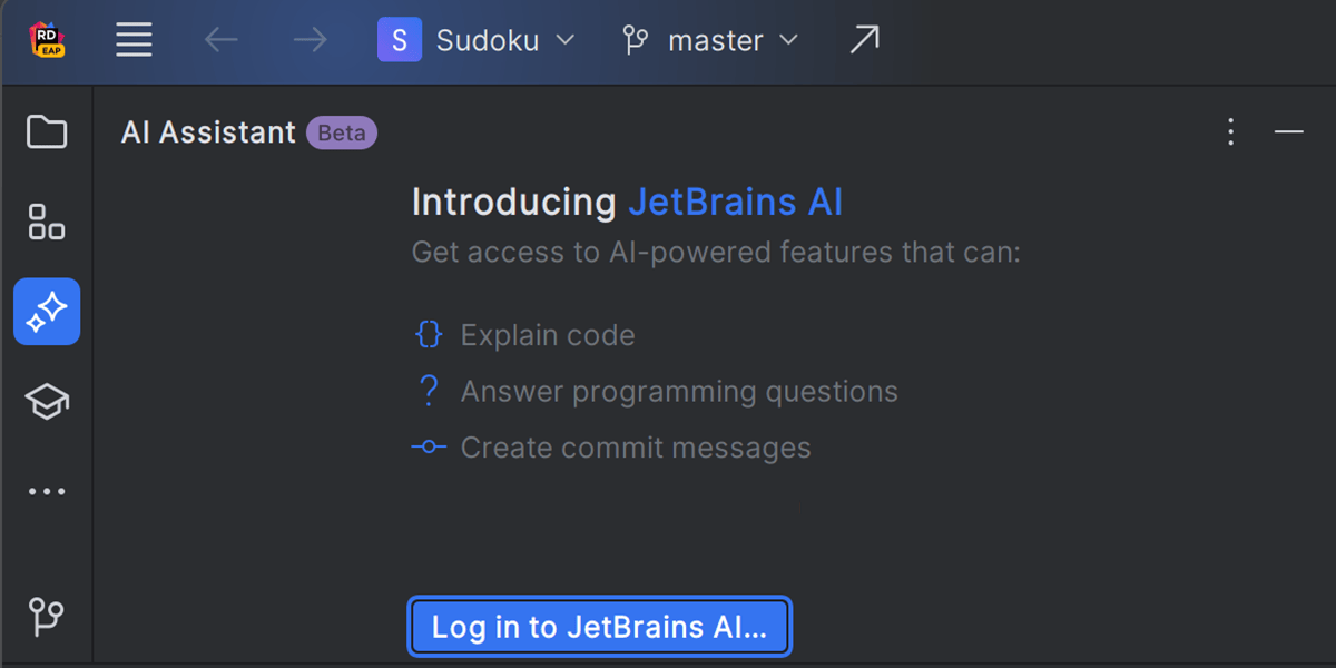AI Assistant 尚未与 JetBrains IDE 的稳定版本捆绑,可以作为适用于版本 2023.2.x 的单独插件安装。 目前,我们还推出了一个等候名单来管理使用 AI Assistant 功能的请求。