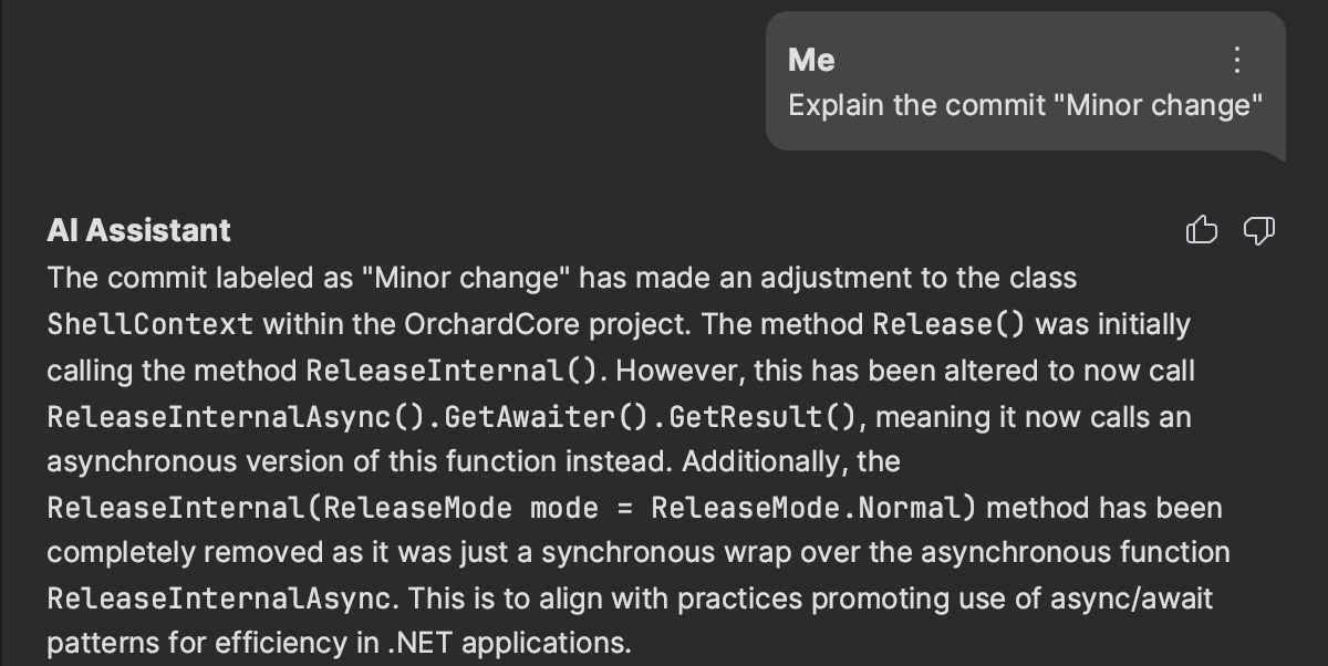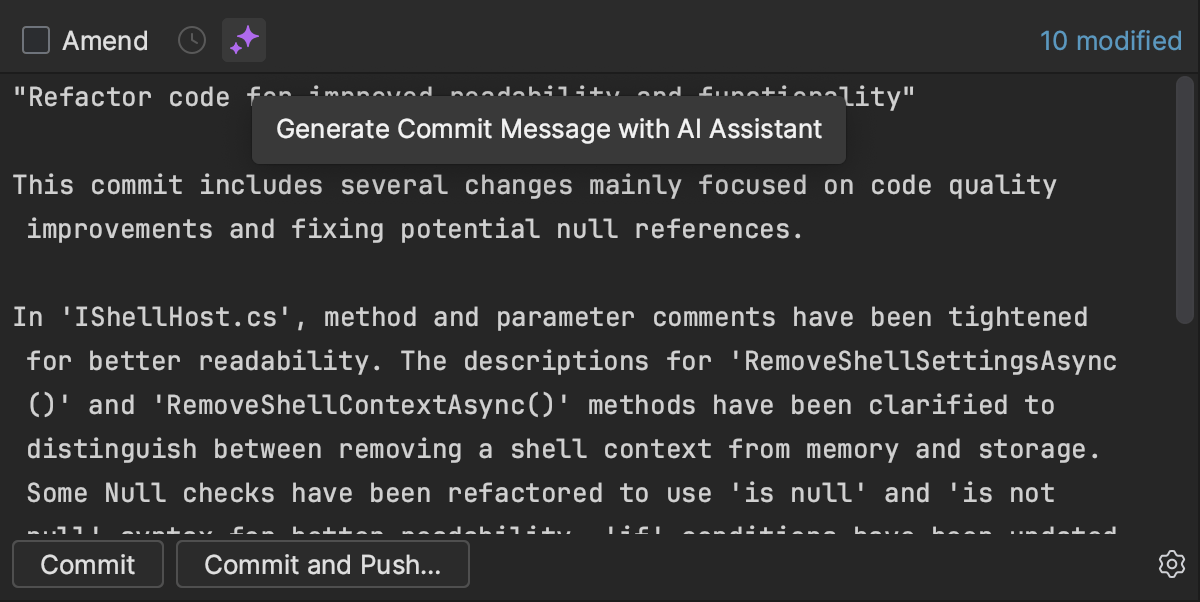 在此版本中,我们为 Rider 引入了一项重要补充 – AI Assistant。 由 AI 提供支持的初始功能集提供了集成式 AI 聊天,并自然融入一些核心 IDE 用户工作流。 AI Assistant 可以分析所选代码、解释提交的含义,以及根据您的规范创建 Unity 文件。