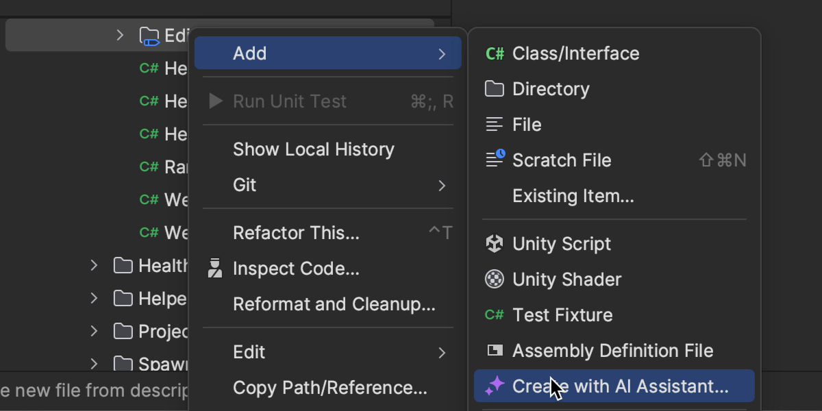 AI Assistant 还可以帮助您为根据您的规范编写的 Unity 解决方案生成文件。 在 Solution Explorer 中右键点击项目,从上下文菜单选择 Create with AI Assistant(使用 AI Assistant 创建),然后编写提示。 在 AI 生成文件内容后,点击 Create New File(创建新文件),它将自动添加到项目中。