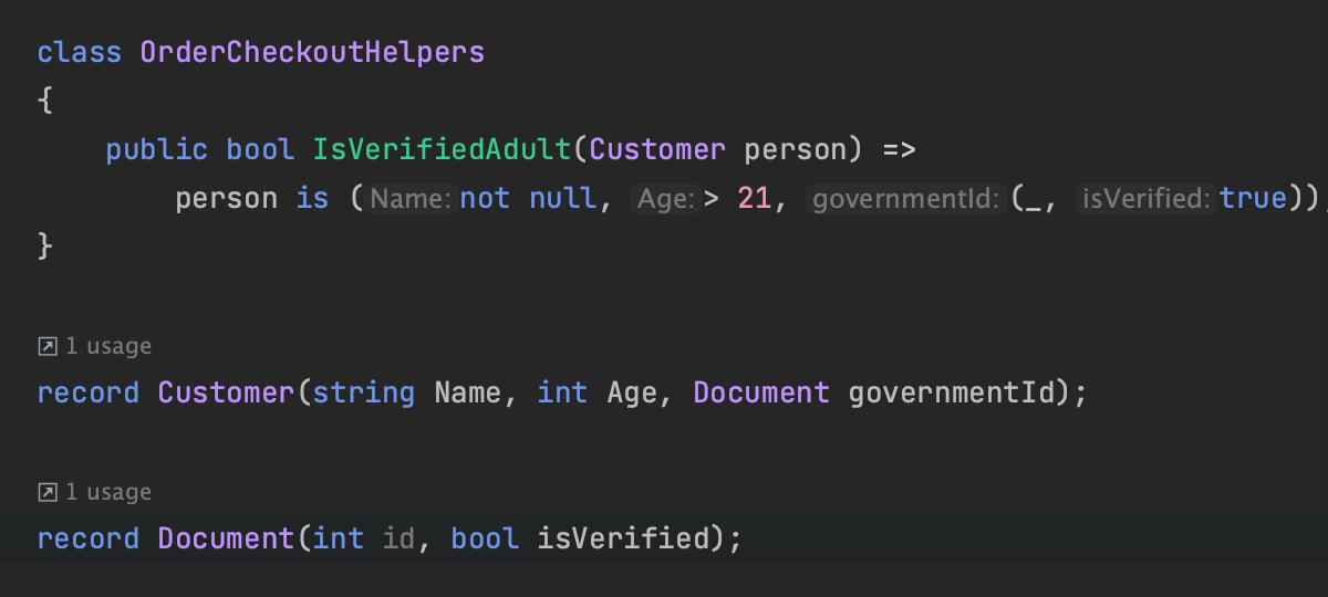 名称可以提高可读性的另一种常见情况是析构模式,其中显式名称可以从 Deconstruct 方法或源元组组件获知。 开发这些提示是为了在模式本身不包含足够的数据来理解匹配的内容(例如 value is ({ }, true, null))时为您提供额外上下文。