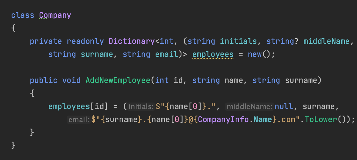 这就是嵌入提示可以派上用场的地方! 当这些名称在组件表达式中尚不明显时,Rider 2023.2 将显示带有元组组件名称的嵌入提示,使代码更易阅读和理解。