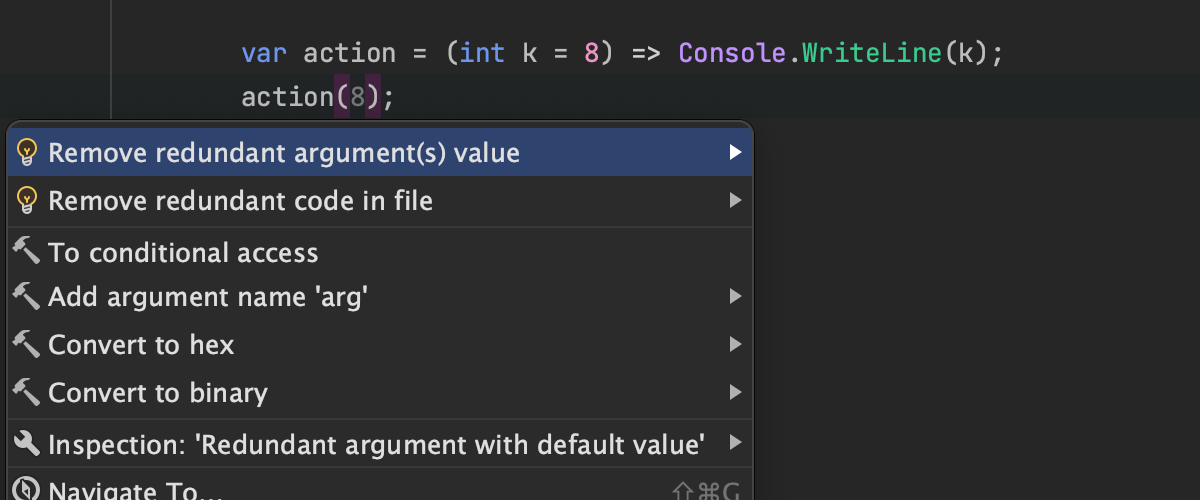 为了支持 C# 12 语言更新,我们引入了对 lambda 表达式中默认形参值的支持。 除了与识别此语法相关的标准警告消息集之外,我们还调整了现有检查 The parameter has the same default value(形参具有相同的默认值),将 lambda 中的默认形参值纳入考量。 有关详情,请参阅此处。