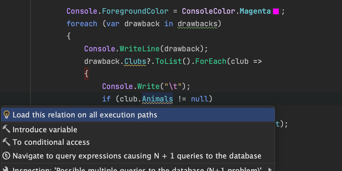 我们为使用 Entity Framework 等对象关系映射 (ORM) 框架处理数据库时可能遇到的常见问题添加了数个新检查、快速修复和上下文导航选项。