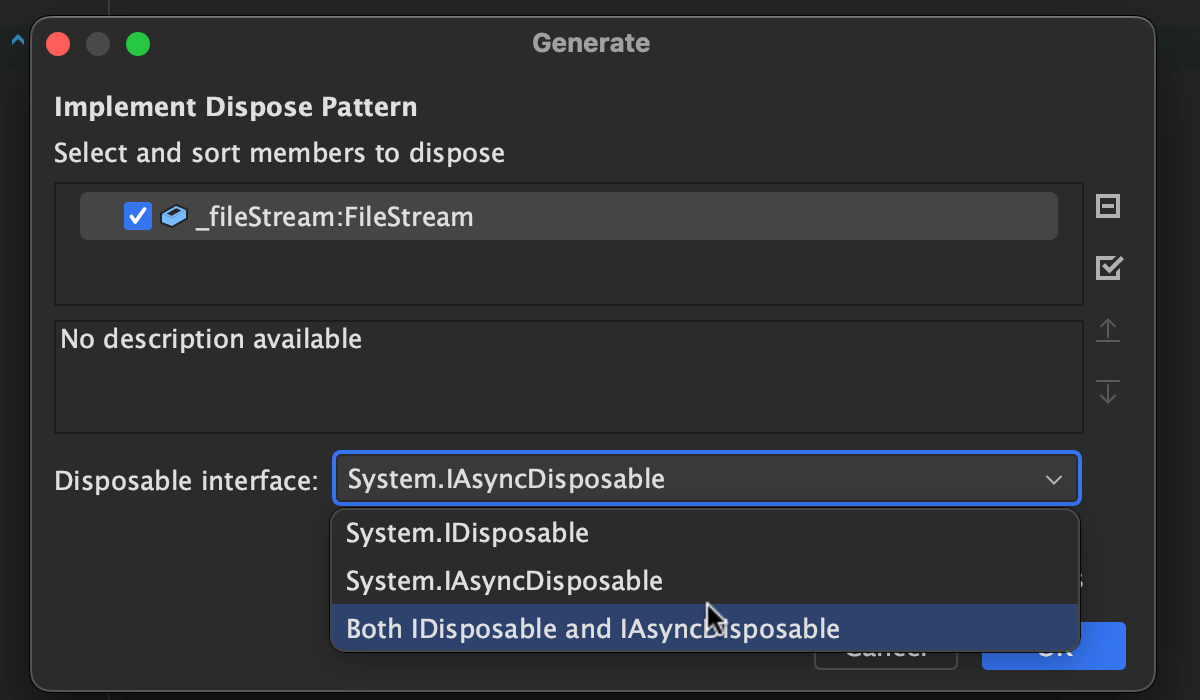 我们还改进了 Generate dispose pattern(生成处置模式)功能,支持 IAsyncDisposable 接口,并能够生成异步方法来释放资源。