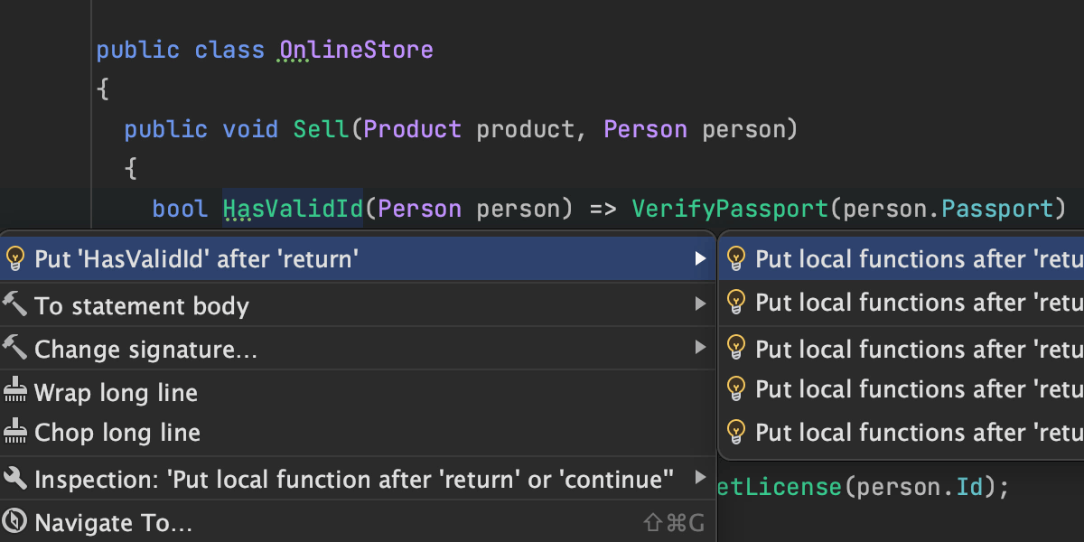Rider 2023.2 引入了两项新检查和相应的快速修复,旨在提高局部函数的代码可读性: