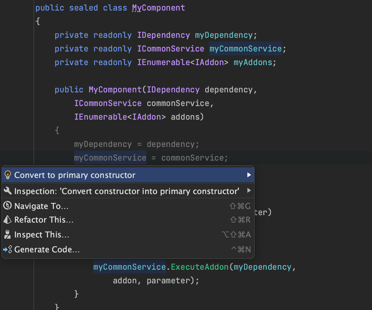 在 2023.2 版本中,我们引入了对 C# 12 预览中的非记录类和结构体的主构造函数支持。 有多项检查可以检测初始化能够以新的主构造函数表示的类型,并建议应用快速修复来大幅减少代码重复的数量。