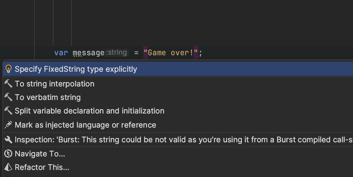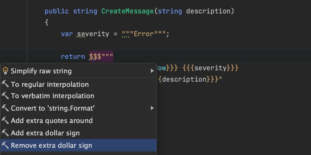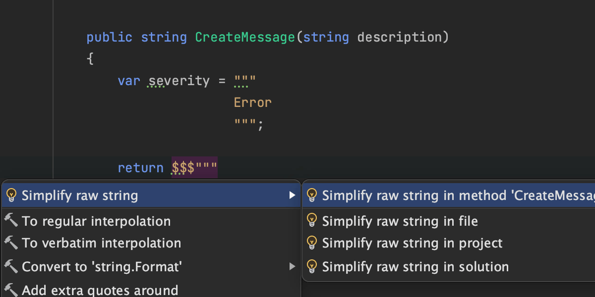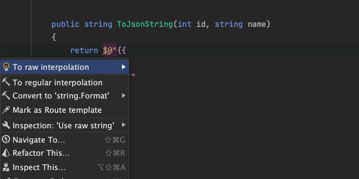 我们为处理原始字符串添加了新的 C# 检查和上下文操作,还改进了输入辅助并增加了格式设置选项: