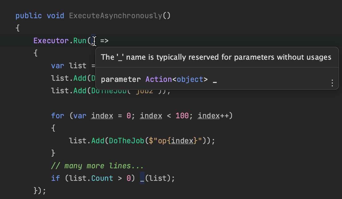 _ 的变量和形参,具有 The _ name is typically reserved for local parameters without usages(_ 名称通常为没有用法的局部形参保留)警告。 它们看起来像是“被丢弃”的值,但实际上,它们所代表的恰恰相反。 查看博文详细了解改进的弃元支持。
