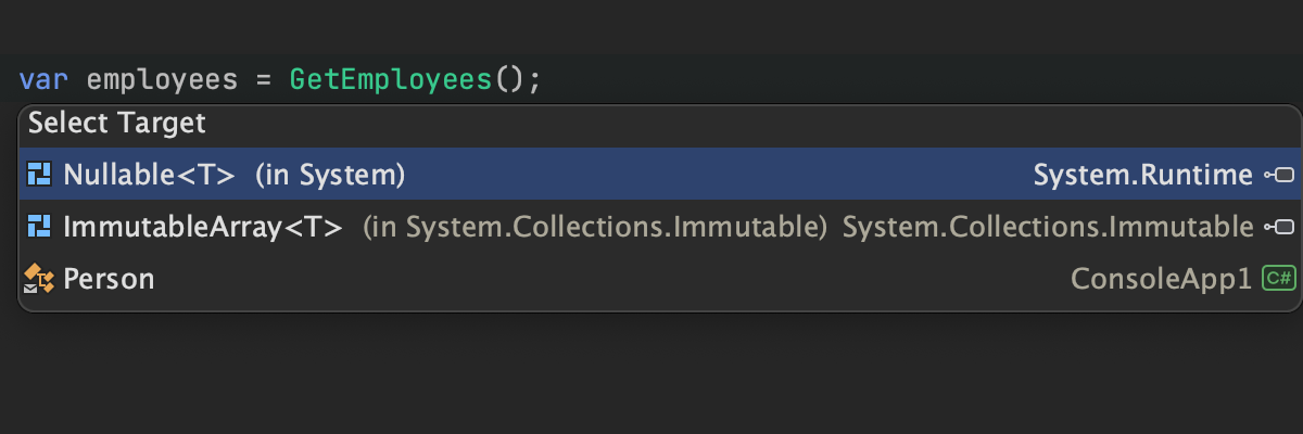 var 声明的导航 为用于包装其他类型的常用类型从 var 导航时,所有导航操作(Go to…(转到…)、Find Usages(查找用法)等)现在都会建议底层类型。 例如,从具有 ImmutableArray<Person>? 类型的变量的 var 关键字使用 Go to declaration(转到声明)操作时,Rider 会建议导航到 Person。