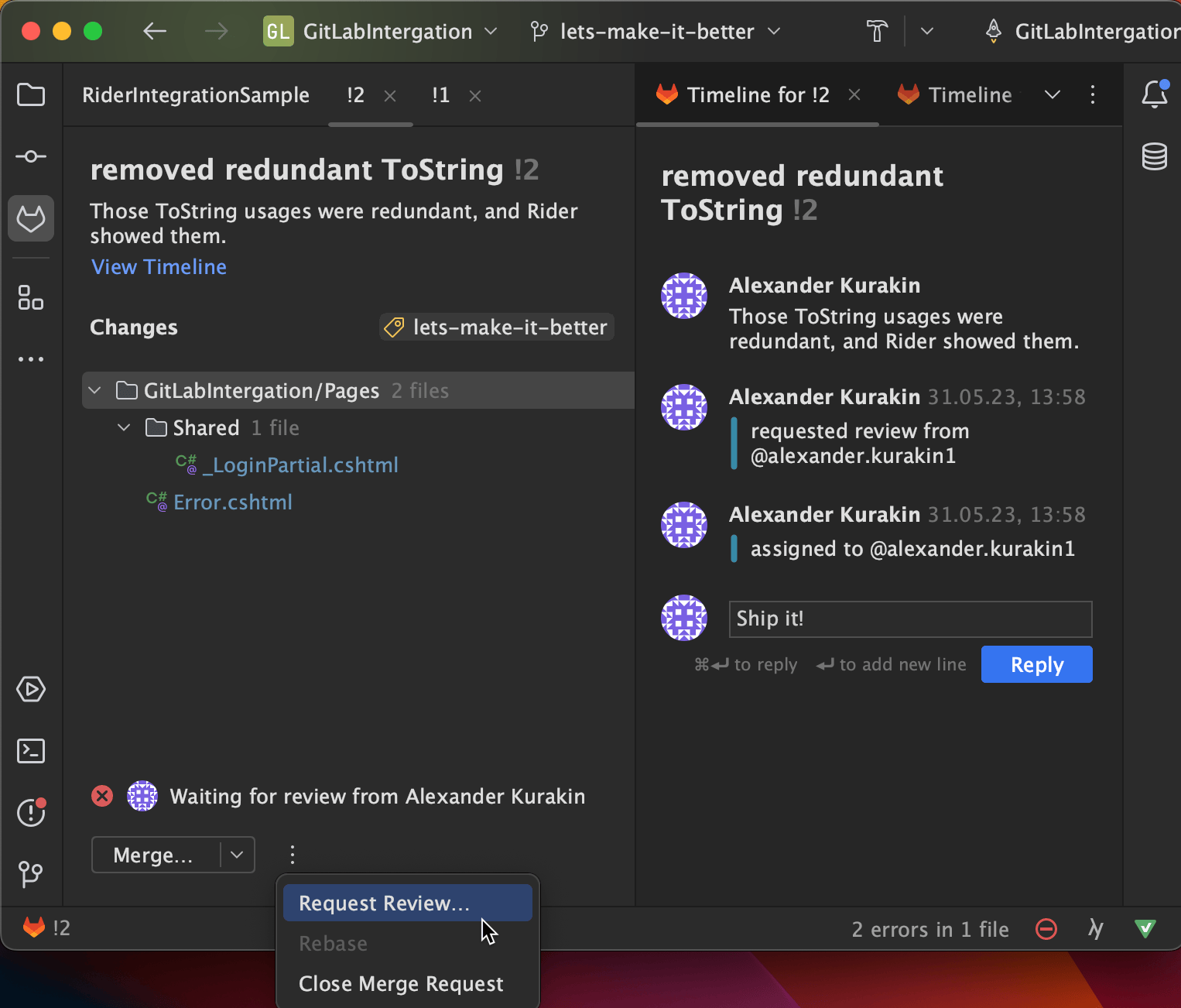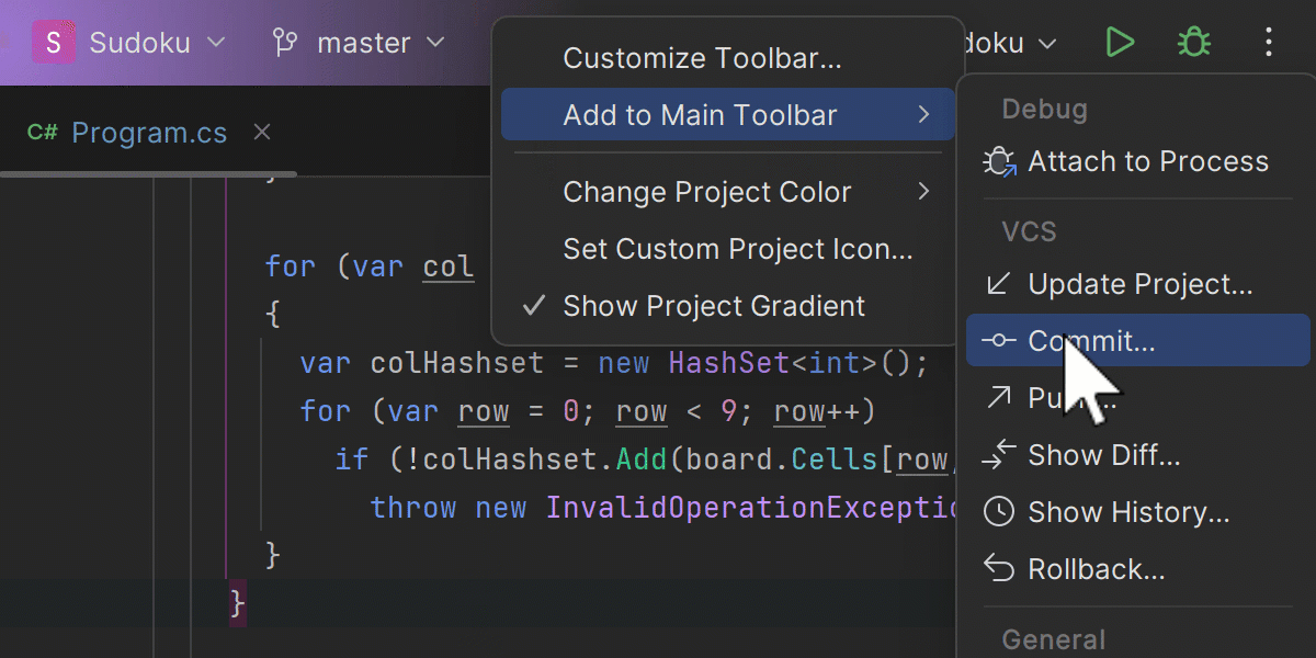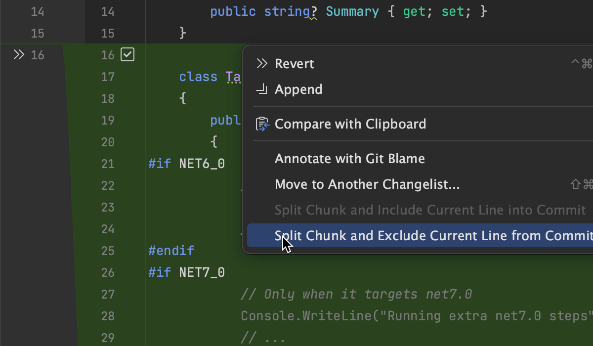 Rider 2023.2 引入了一项备受期待的功能,可供有选择地提交代码区块的特定部分。 要执行部分提交,请选择区块中的行,然后从上下文菜单中调用 Include these lines into commit(将所选行包含到提交中)。 区块将被分为单独的行,所选行将被高亮显示。 您可以使用复选框或上下文菜单在选区中添加或排除行。