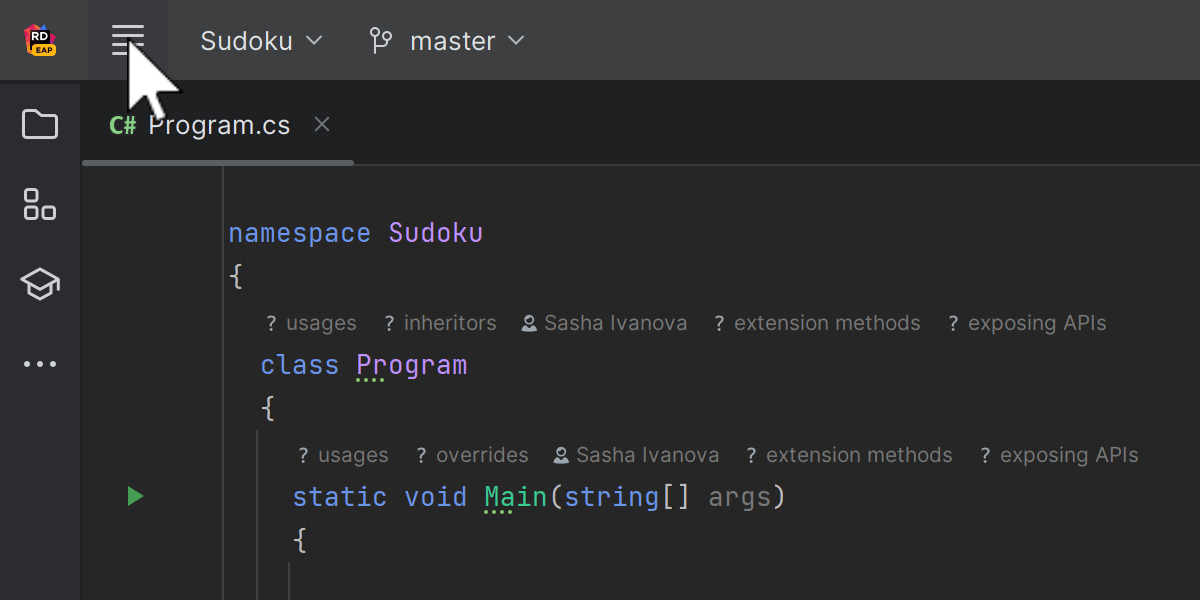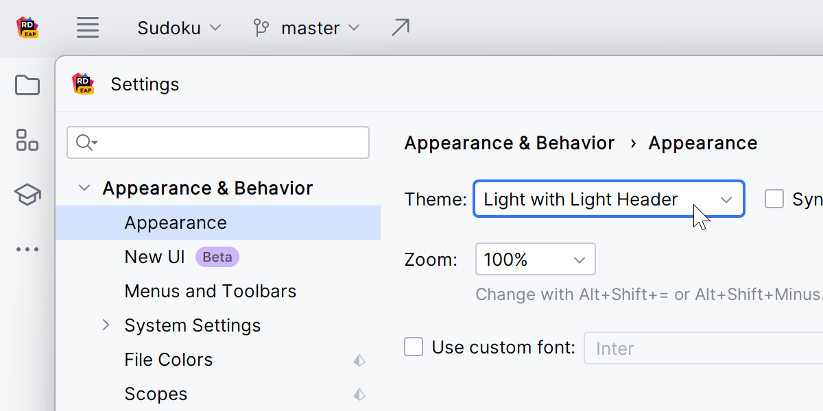 在此版本中,重新设计并在 Rider 2022.3 中首次亮相的 IDE 界面将成为所有新用户的默认界面。 如果您尚未转换,我们建议您前往 Settings / Preferences | Appearance & Behavior | New UI | Enable new UI(设置/偏好设置| 外观与行为 | 新 UI | 启用新 UI)尝试一下。
