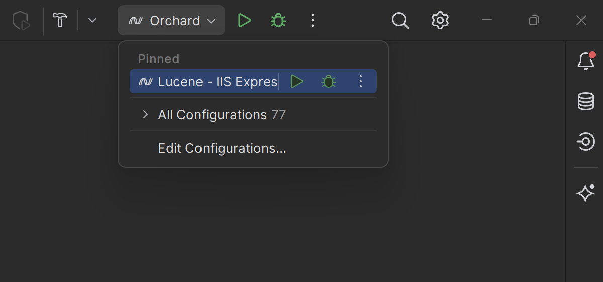 为了简化多个运行配置的管理,我们在 Run(运行)微件中实现了固定首选配置的选项。 要将运行配置添加到 Pinned(固定)部分,首先打开其名称旁边的竖三点菜单,然后选择 Pin(固定)。 如果有多个固定的配置,在列表中拖放即可轻松排列。