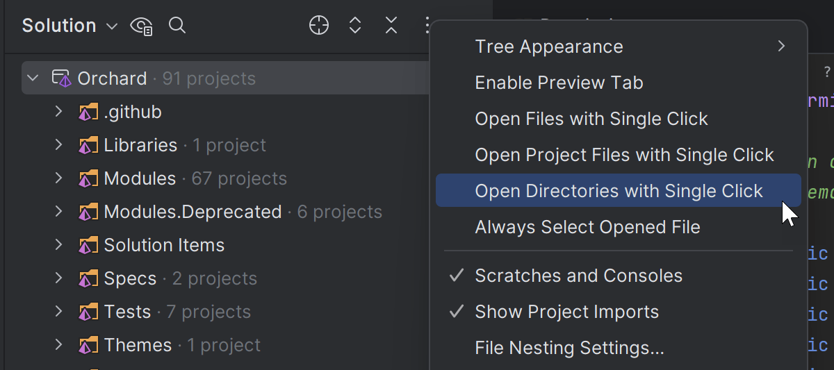 在 Solution Explorer 工具窗口中,新增了 Open Directories with Single Click(单击打开目录)选项,可以更快展开和收起项目文件夹,更快响应。 选项位于三点图标菜单中。