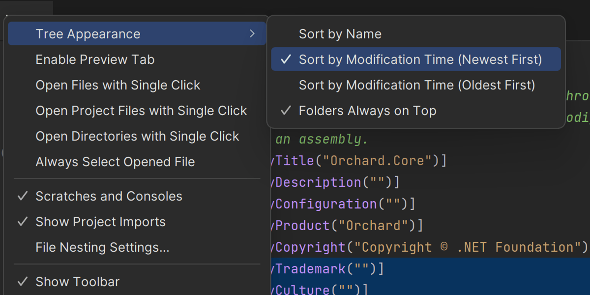Rider 2023.2 添加了备受期待的选项,可根据修改时间在 Solution Explorer 中排列文件。 每当项目中有更改被保存时,这个新功能就会自动重排文件。 要启用此功能,首先在 Solution Explorer 中打开竖三点菜单,然后选择 Tree Appearance | Sort by Modification Time(树外观 | 按修改时间排序)。