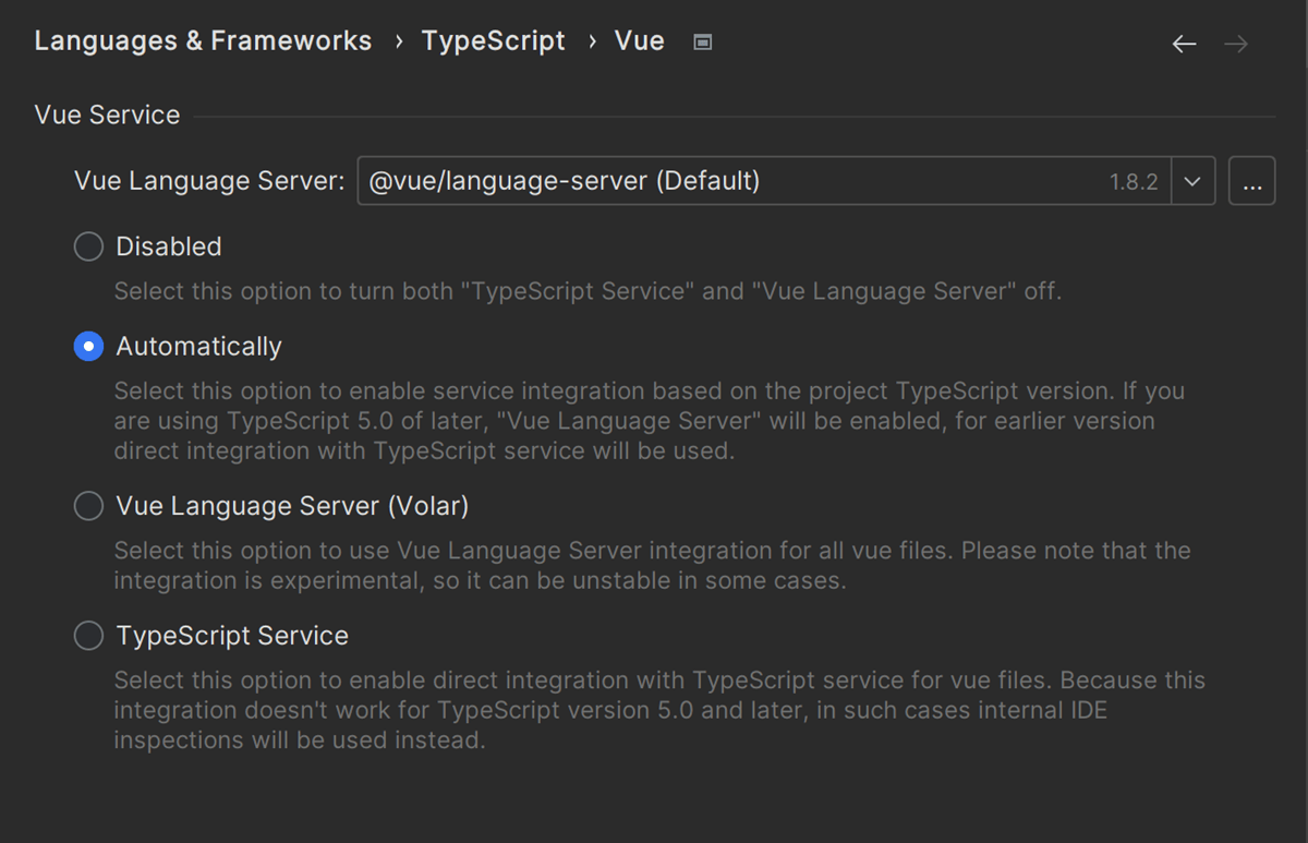我们为 Vue 用户带来了一些好消息! 初始的 Volar 支持已经登陆 Rider,助力提供更准确的错误检测。 默认情况下,Volar 将用于 TypeScript v5.0 和更高版本,我们自己的实现将用于更早版本。 在 Settings | Languages & Frameworks | TypeScript | Vue(设置 | 语言和框架 | TypeScript | Vue)下,您可以将 Vue 服务设置为在所有 TypeScript 版本上使用 Volar 集成。
