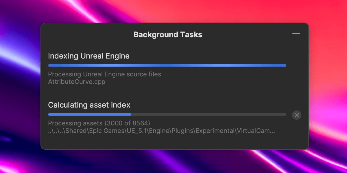 在 2023.2 中,Rider 现在将在对所有 C++ 代码编制索引后将资源索引编制作为后台任务。 在 Rider 编制资源索引期间,您将能够在编辑和导航代码时享受代码高亮显示的好处。
