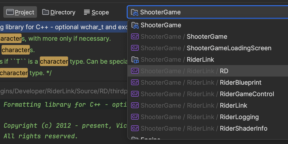 Rider 2023.2 包含许多其他针对 C++ 游戏开发的实用更新和修正。 我们改进了一个特别棘手的场景:此前 Rider 在处理非常大的项目文件时会挂起。 现在,在使用基于 .uproject 的解决方案时,Rider 可以轻松地将 Find In Files(在文件中查找)的作用域限制为插件目录。 RiderLink 插件获得多项修正,支持使用最新的 VC++ 工具链构建。