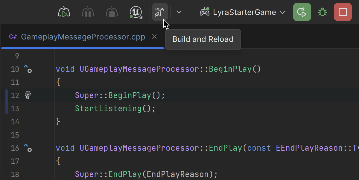 Rider 现在支持从 IDE 调用热重载或实时编码,允许您在编辑器运行时更新 Unreal 应用程序。 在 Unreal 编辑器中启用其中一项功能后,Rider 将显示 Build and Reload(构建并重新加载)工具栏按钮,用于在 Unreal 加载更新时编译更改。