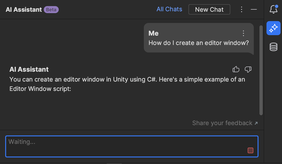 新的 AI Assistant 是解决问题和学习的工具,我们希望它可以为 Unity 开发者提供帮助。 当您处理 Unity 项目时,Rider 会告知 AI Assistant。因此,如果您提出“如何创建编辑器窗口?”或者“如何添加菜单项?”之类的问题,AI Assistant 能够明白您指的是 Unity 编辑器中的窗口或菜单项,并建议 Unity API 来帮助您实现目标。