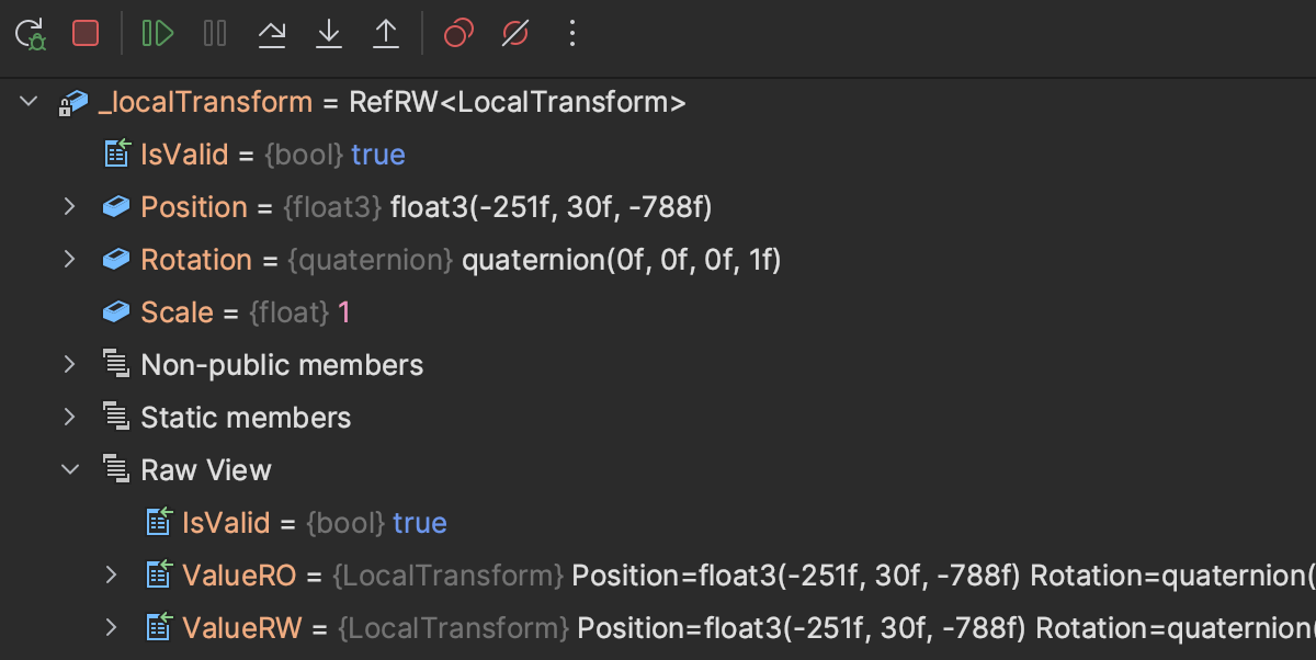 调试器也开始理解 DOTS。 RefRO 和 RefRW 类型的改进表示现在将更直观地显示引用包装器背后的值。 不过,您仍然可以展开 Raw Value(原始值)节点来查看原始表示。