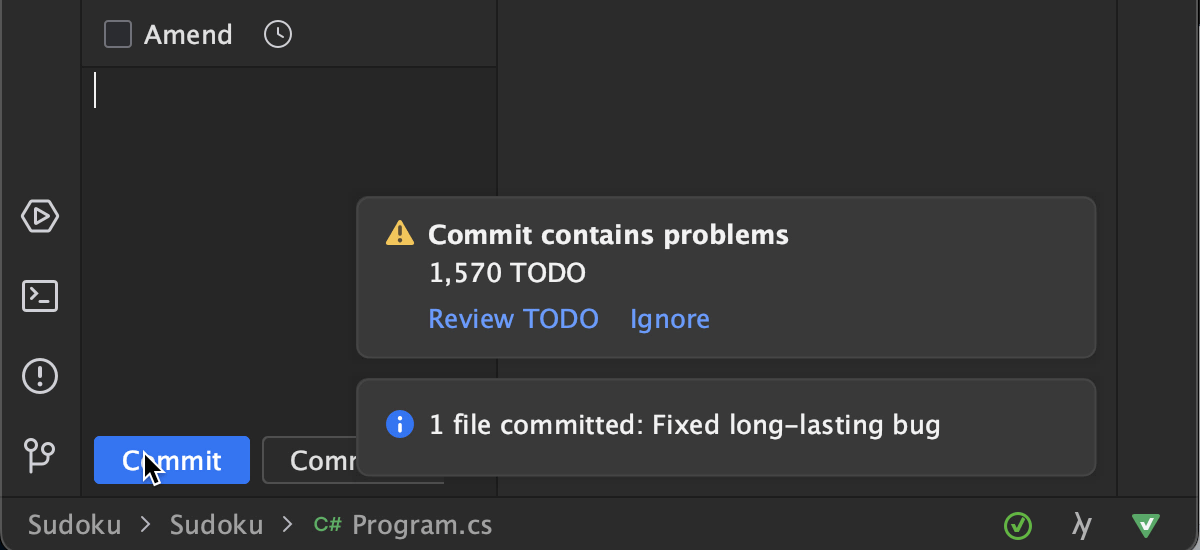 我们重做了 Git 和 Mercurial 提交检查的行为,旨在加快整个提交流程。 检查将在提交之后且推送之前在后台执行。