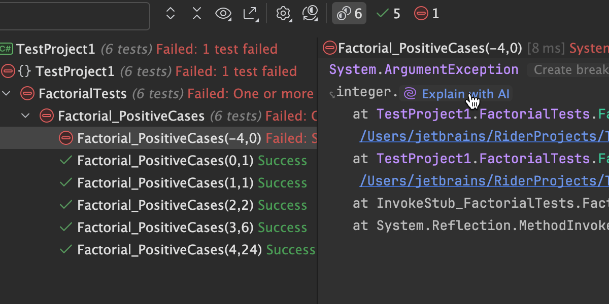 我们在单元测试失败、构建失败或调试会话期间抛出的异常或错误消息旁添加了 Explain with AI(使用 AI 解释)按钮。