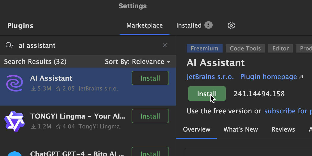 请注意,在版本 2024.1 中,AI Assistant 已解绑,现在作为独立插件提供。 这一改动是为了在使用 AI 赋能的技术方面提供更多的决策灵活度,让您能够在工作环境中更好地控制偏好和要求。 AI Assistant 仍然需要有效的 JetBrains AI 订阅。