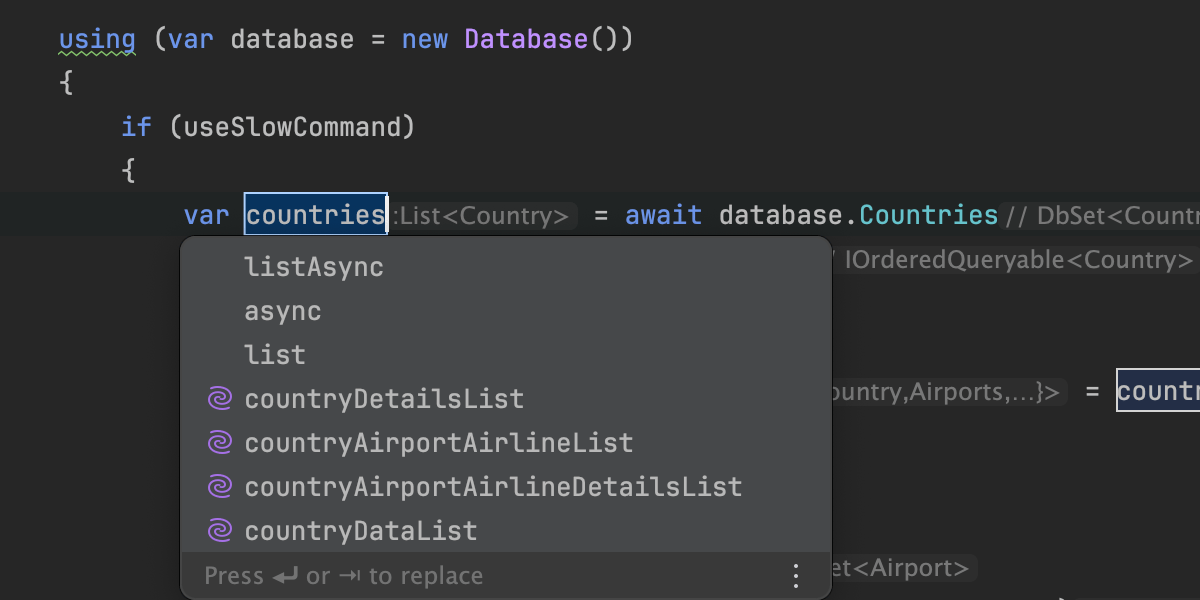 重命名局部变量时,您将在代码补全弹出窗口中获得 AI 赋能的名称建议。