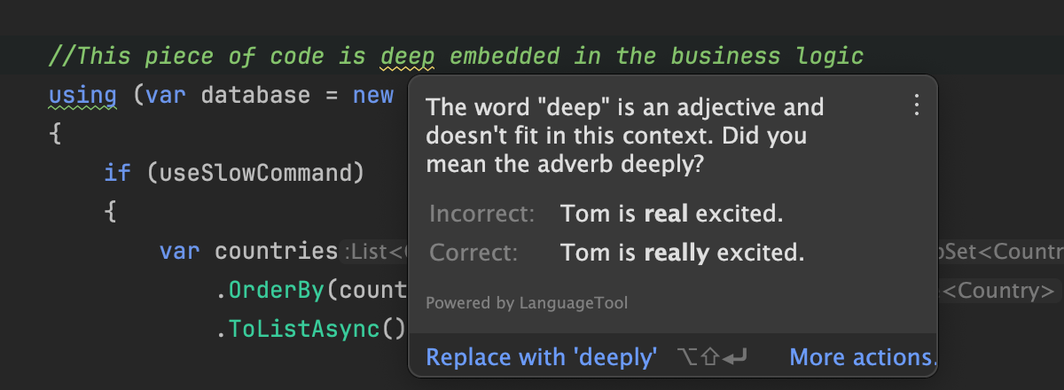继 ReSharper 之后,Rider 也获得了升级的拼写和语法检查器。 新的拼写检查器支持 20 多种语言,能够在 Rider 支持的编程语言(C#、C++、VB.NET)、标记语言(HTML、XML、XAML)和注释中捕获自然语言错误。