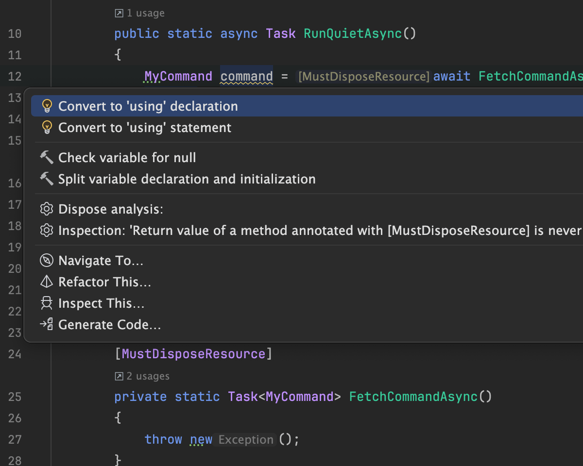 [MustDisposeResource] 注解改进:C# 代码分析现在可以确保正确处置异步方法返回的资源(包括 Task<IDisposable> 和 ValueTask<IDisposable> 中包装的资源),帮助您避免意外处置任务本身。 .ConfigureAwait(...)、.AsTask() 或 .Result 检索的资源。