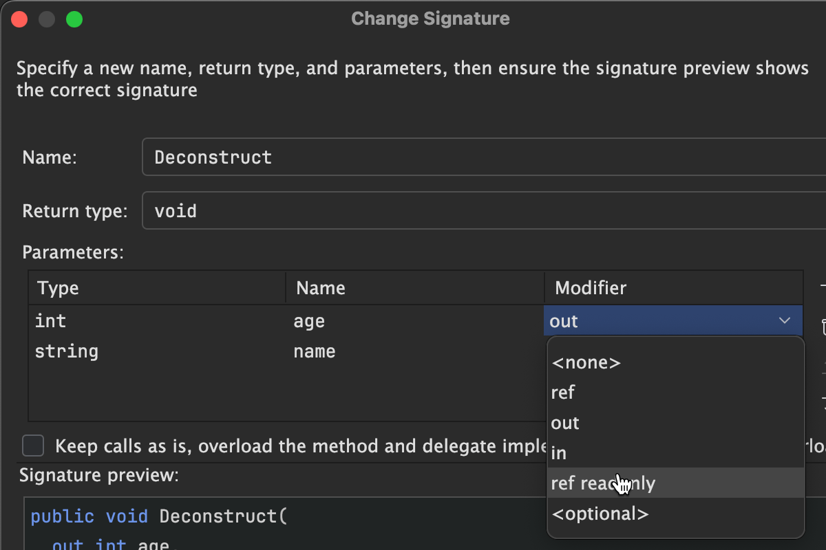 以下是我们对 Change Signature(更改签名)重构所做的一些改进: