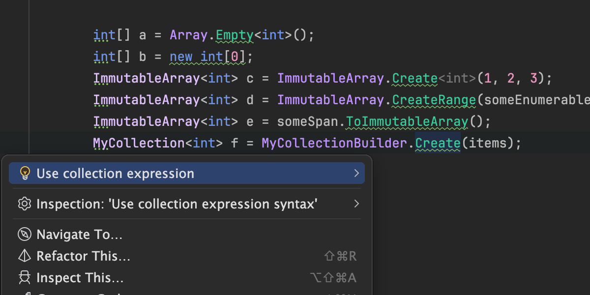 现在,您将获得建议,将源代码中的更多代码结构转换为 C# 12 中的集合表达式,例如空数组或 ImmutableArray 声明和初始化。
