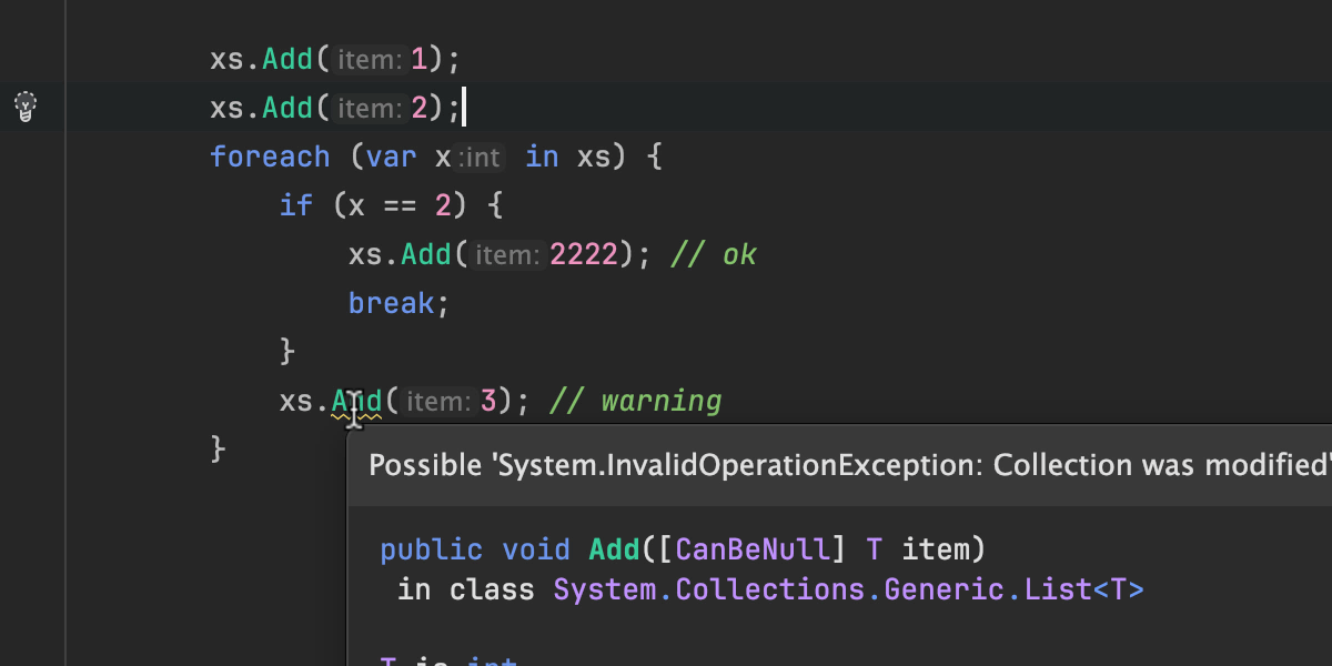 我们添加了新的 Possible 'System.InvalidOperationException: Collection was modified'(可能的 'System.InvalidOperationException: 集合已被修改')检查,在 foreach 循环内迭代期间修改集合时,它会发出警告,因为此修改可能会导致运行时异常。 此分析了解集合修改后退出循环的情况,这些情况不会触发警告。 检查附带对应快速修复,可以帮助您立即解决此问题。