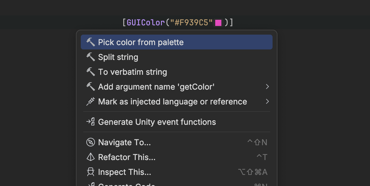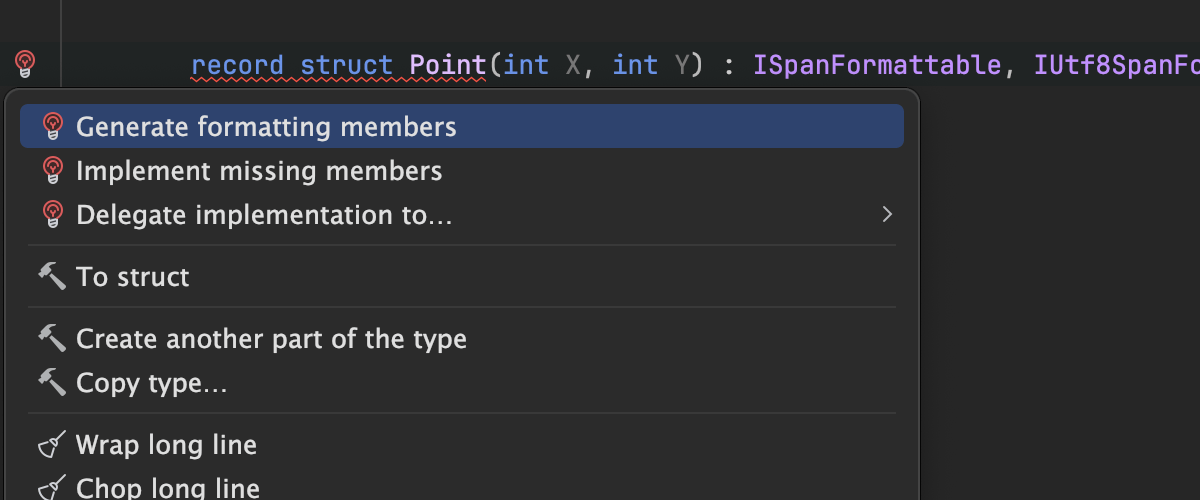Generate | Formatting Members(生成 | 设置成员格式)可供生成样板代码来重写 ToString() 方法并为类型返回有意义的字符串。 从 2024.1 版本开始,此功能支持更多类型,例如 ISpanFormattable、IUtf8SpanFormattable 和 IFormattable。