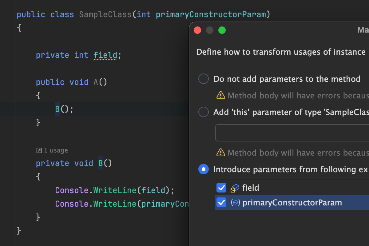 在此版本中,Make Static(设为 static)重构支持主构造函数形参。 它们位于 Introduce parameters(引入形参)列表中,并具有单独的图标帮助您轻松区分。 此重构也适用于局部函数。