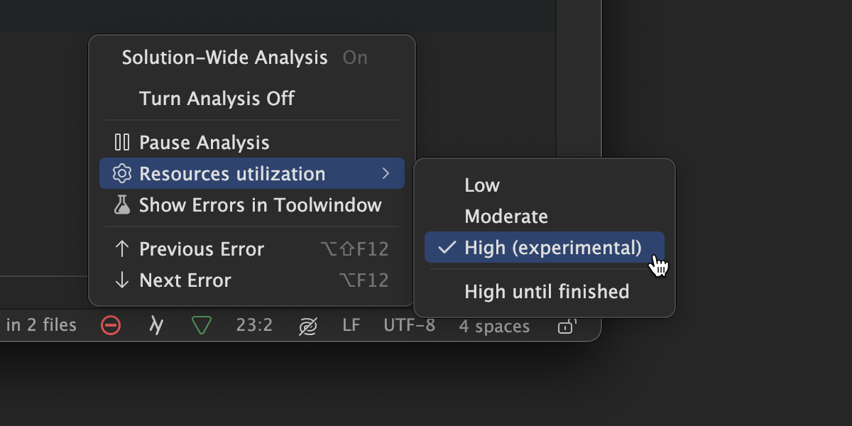 我们正在为解决方案级分析积极完善高资源利用率模式,通过更有效地利用 CPU 并行性显著缩短分析时长。 我们改进了代码分析活动的内存分配分析,最大程度地减少垃圾回收所花费的时间。 优化过程仍在推进,我们欢迎您启用此模式并提供体验反馈。